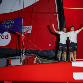 Emmanuel Le Roch and Basile Bourgnon, skippers of the Ocean Fifty Edenred 5, crossed the finish line of the Transat Café L'Or in Fort-de-France, Martinique, at 1:36:09 a.m. on Friday, November 7, 2025 (Paris time). Completing the 4,700-mile course in 12 days, 10 hours, 6 minutes, and 6 seconds, Basile Bourgnon and Emmanuel Le Roch took 5th place in Ocean Fifty, just four months after Edenred 5 was launched. Leading the race until Monday evening, then falling victim to a broken connecting bar, the Edenred 5 duo saw their chances of a well-deserved victory slip away. Nevertheless, Basile and Emmanuel made a remarkable journey and left a lasting impression in their first transatlantic race in the Ocean Fifty class. (Photo credit: © Jean-Marie Liot / Alea)